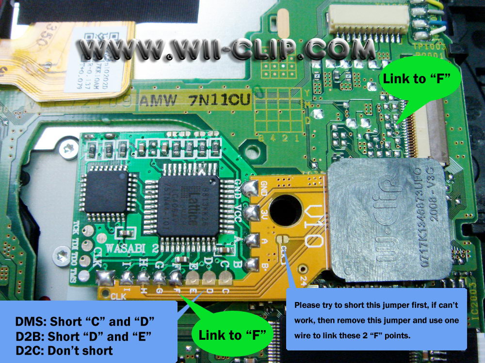 The V10 CLIP install diagram, firstly you just need short the "CLK" jumper, and test it, if it working fine, then you don't need solder any extra wires again. This way should work with almost wii.